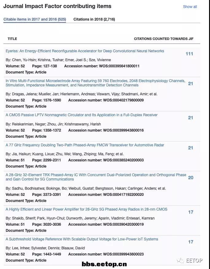 下面我们具体分析JSSC的相关数据。图2展示了2018年JSSC影响因子的具体计算公式。它是指在2018年全年内,被引用的2017年和2016年JSSC 论文次数(2716)除以 2017年和2016年总共发表的论文数(525)。