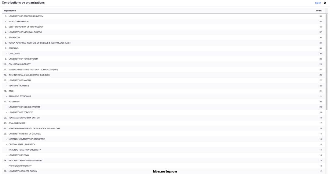 图5显示了JSSC贡献前50名的大学或者公司。加州大学系统和英特尔分别列为贡献最多的大学和公司首位。